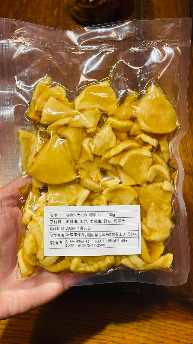 ーーーーーーー 漬物用の大根をスライスしてから、 芳泉茶寮で毎日、日に当てて干した大根。 長南町の米と大豆で醸した自家醸造醤油と、純米酢でタレを作って漬けました。 加糖はしていませんが、大根の甘みとほろ苦さが心地よい漬物に仕上がりました。 【原材料】 ・大根、米醤油、純米酢、麦醬油、昆布、鷹の爪 【賞味期限】パックから開けたらなるべく早くお召し上がりください。
